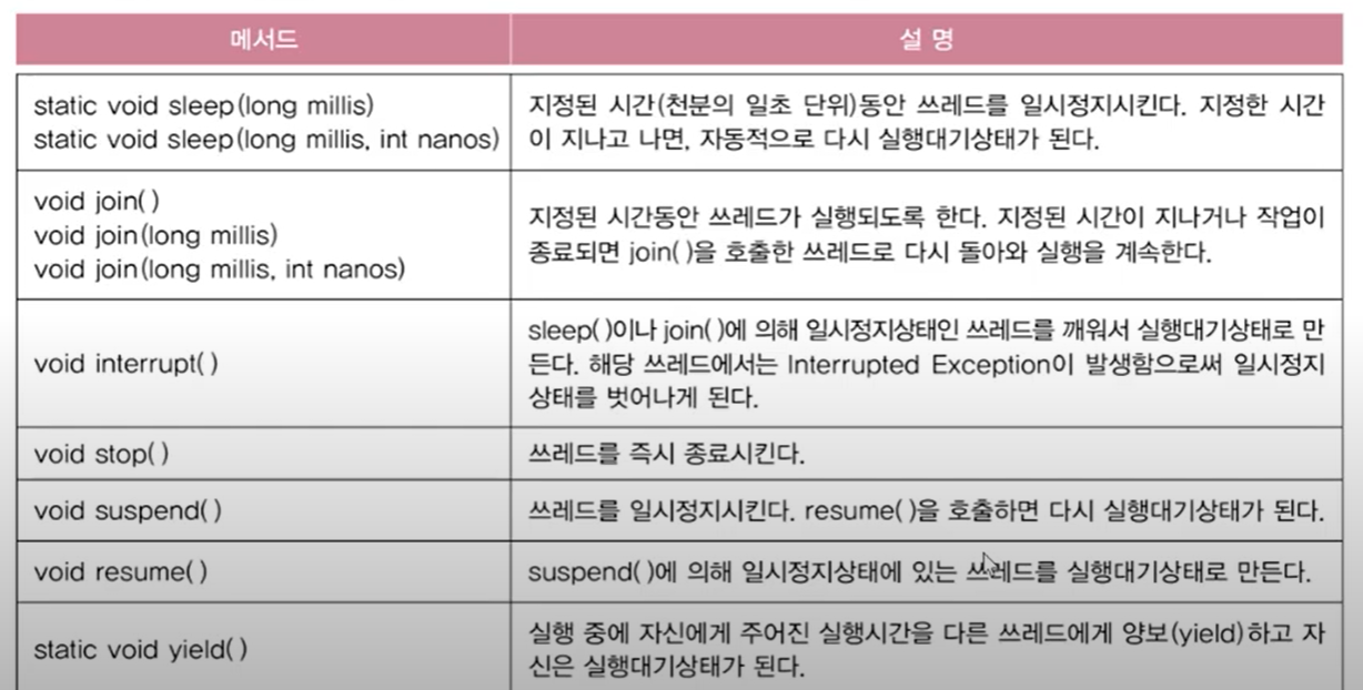 runnable의 과정에 쓰레드의 실행에 관여(방해)하는 메서드들이 존재하는데 그 메서드들은 아래와 같다.