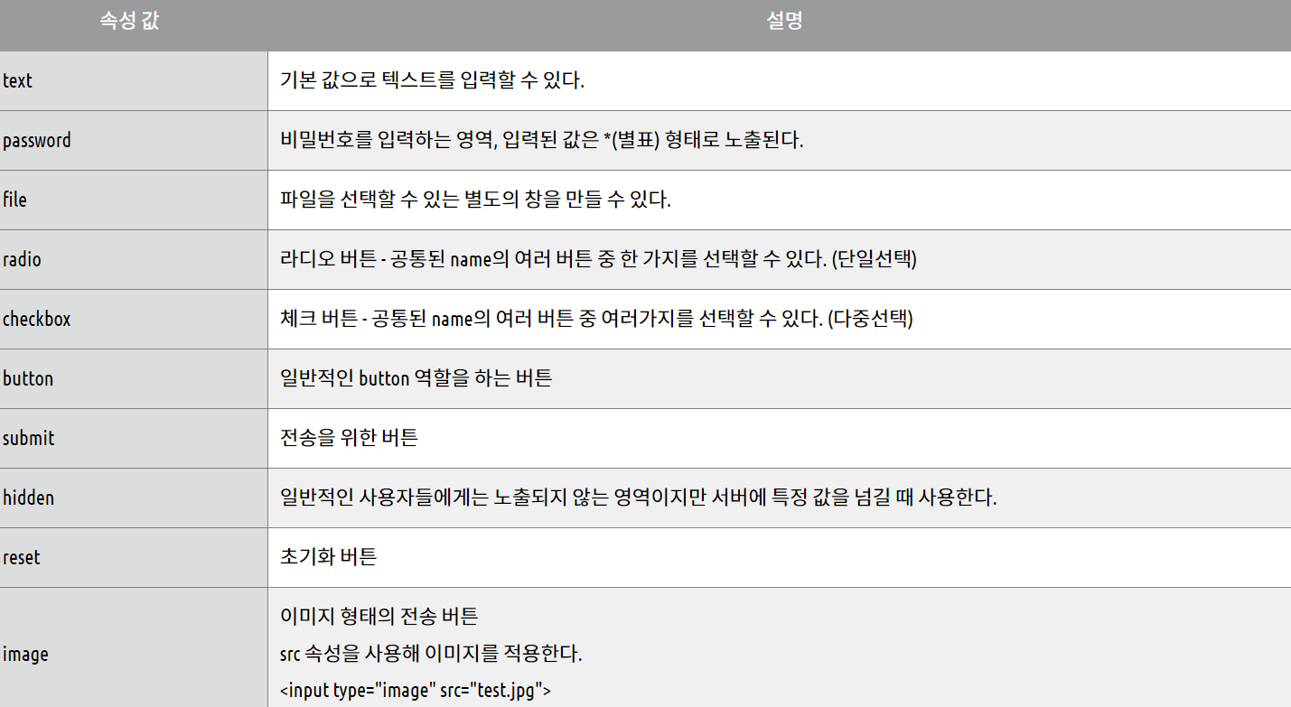 input이 어떻게 동작할 것인가를 정해준다 i.e) <input type = "button" name = "b">