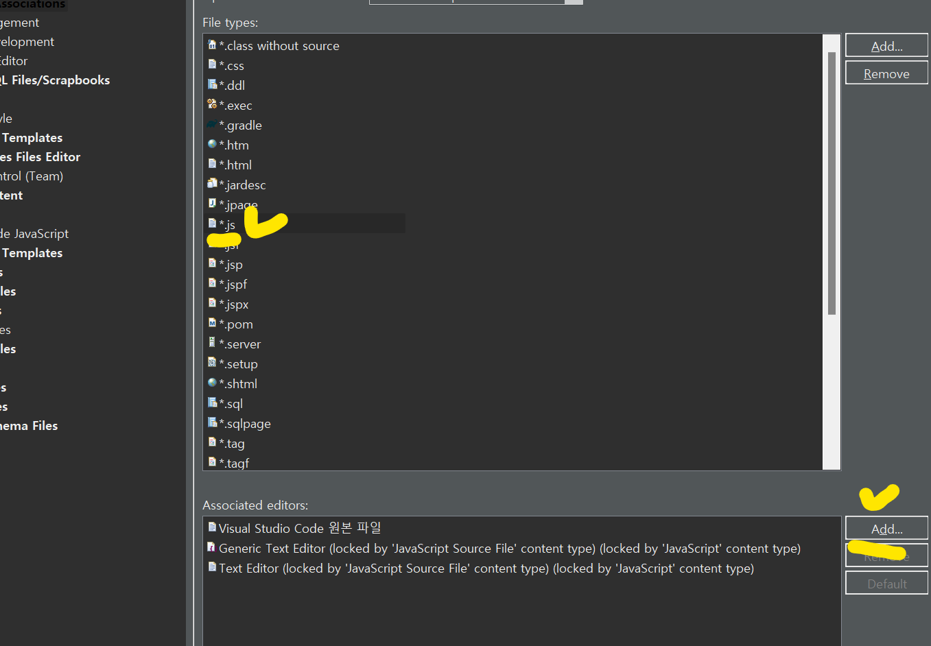 이클립스 Preference > file 검색 > Editor 하단에 File Association에서 VSC와 연동할 확장 파일 선택