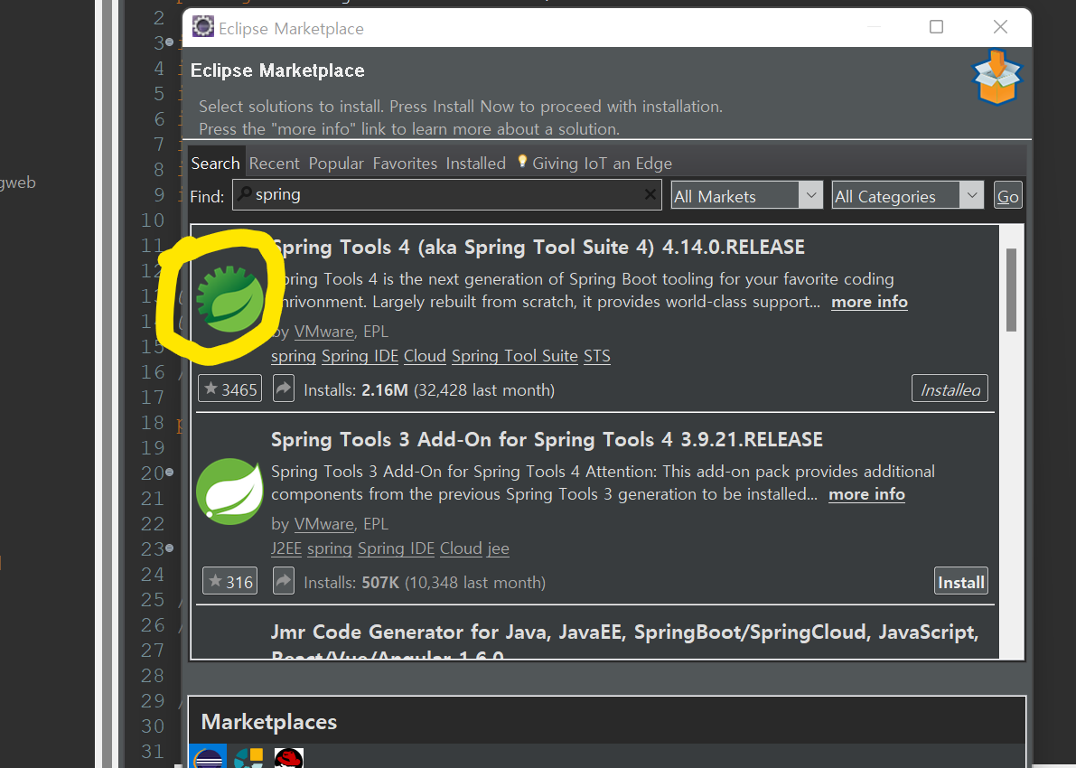 이클립스 마켓플레이스에서 아래 스프링을 다운 받고 이클립스를 재실행한다.