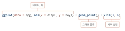 ggplot(data = mpg, aes(x = displ, y = hwy)) + geom_point() + xlim(3, 6)