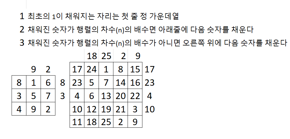 // > 3*3 마방진이면 2가 3의 배수면 아래줄 다음 숫자