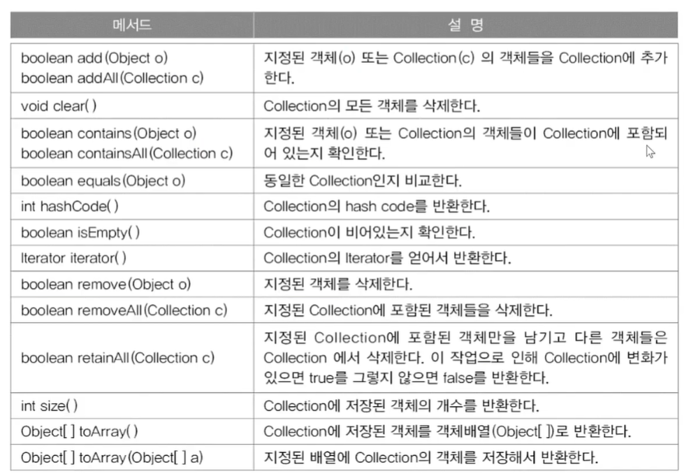 Collection: 여러 객체(데이터)를 모아 놓은 것을 의미